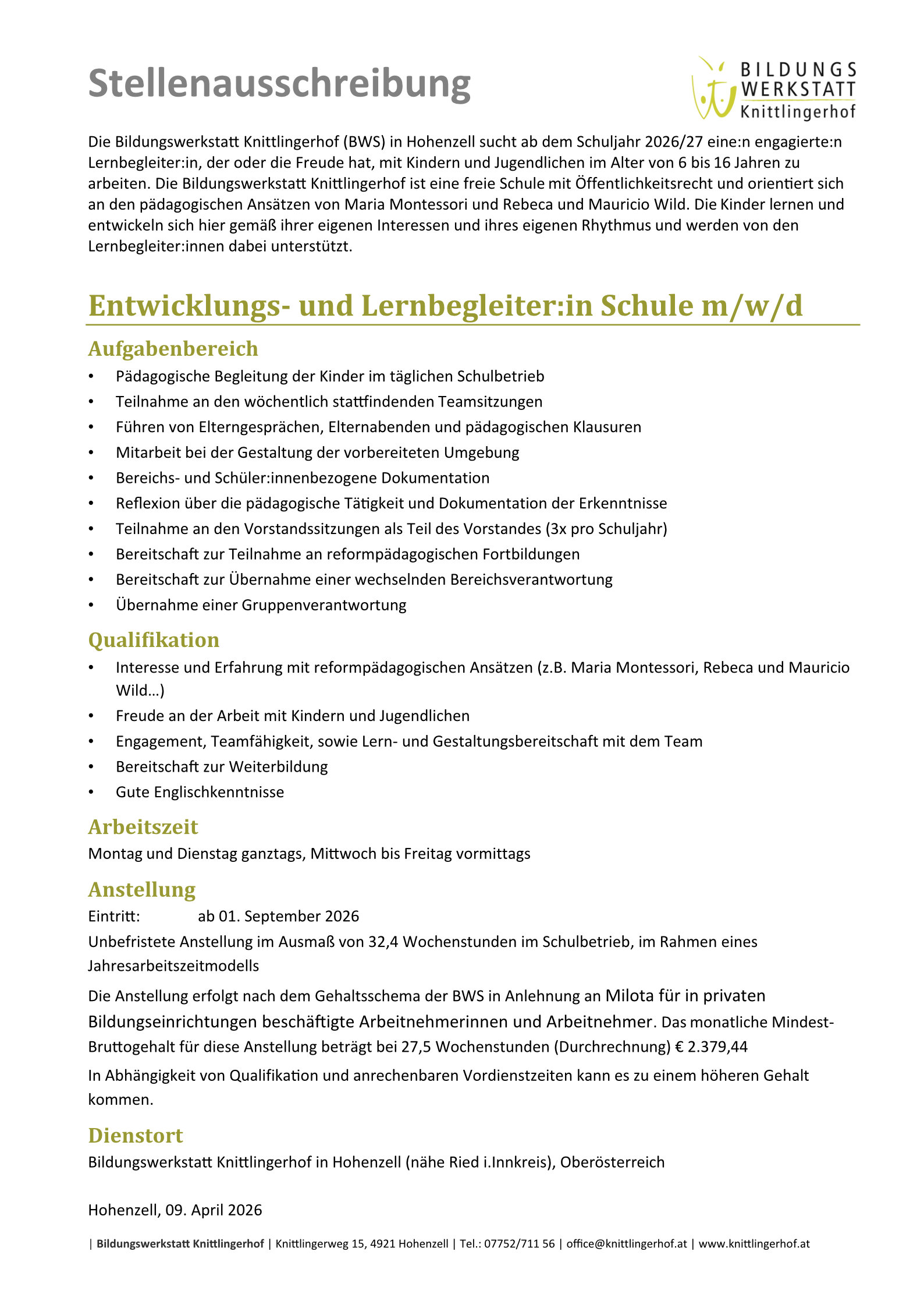 Die Bildungswerkstatt Knittlingerhof (BWS) in Hohenzell sucht ab dem Schuljahr 2026/27 eine:n engagierte:n Lernbegleiter:in, der oder die Freude hat, mit Kindern und Jugendlichen im Alter von 6 bis 16 Jahren zu arbeiten.